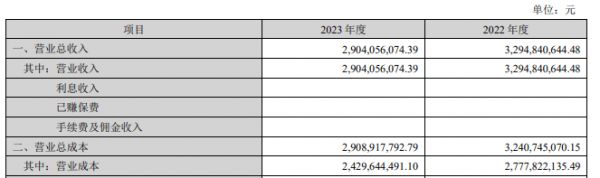 海鸥住工(002084.SZ)4月20日发布年度业绩报告称,2023年营业收入约29.04亿元,同比减少11.86%;归属于上市公司股东的净利润亏损约2.33亿元;基本每股收益亏损0.3599元。