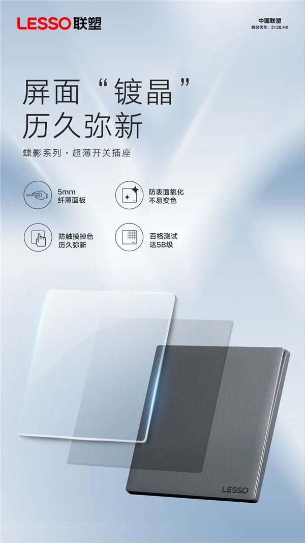 联塑超薄开关谍影系列,采用屏面“镀晶”工艺,防表面氧化,不易变色;百格测试可达5B级,防划耐刮不留痕,持久如新。