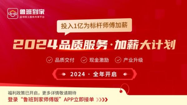 此外,鲁班到家平台还推出了“2024品质服务·加薪大计划”,再投入亿元现金为标杆师傅加薪,全年度以不同形式活动,为平台的普通师傅、标兵师傅、团队师傅发放服务补贴。