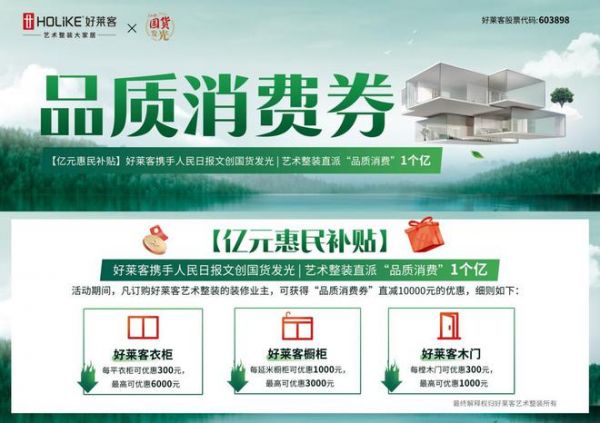 在时代的洪流中,高品质的、健康环保的理念逐渐深入人心,成为现代家居生活的重要追求。延续健康环保核心理念,好莱客在“4.26世界无醛日”十周年之际,携手权威官媒「人民日报文创丨国货发光」重磅发起国货发光美好生活季派券惠民活动。作为好莱客旗下一站式整装服务平台,好莱客艺术整装今年首次参与到4.26整合营销传播当中,以“整家新体验,质在一站购”为主题,联合全国终端派发消费券。共同倡导高品质的、绿色健康的理想人居生活理念,让一站式品质健康整装真正走进千家万户。
