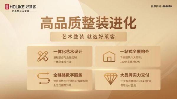 经过 22 年的深耕和沉淀,好莱客现已从专注单渠道到进军全渠道,全面布局多渠道、多品类。好莱客艺术整装作为好莱客零售经销系统之后的 toC 第二曲线,肩负着好莱客未来业绩增长与市场版图扩张的重任。作为好莱客旗下集艺术设计、装修、定制、宅配以及主辅材供应链为一体的一站式整装服务平台,好莱客艺术整装为消费者打造一站式的整装解决方案。