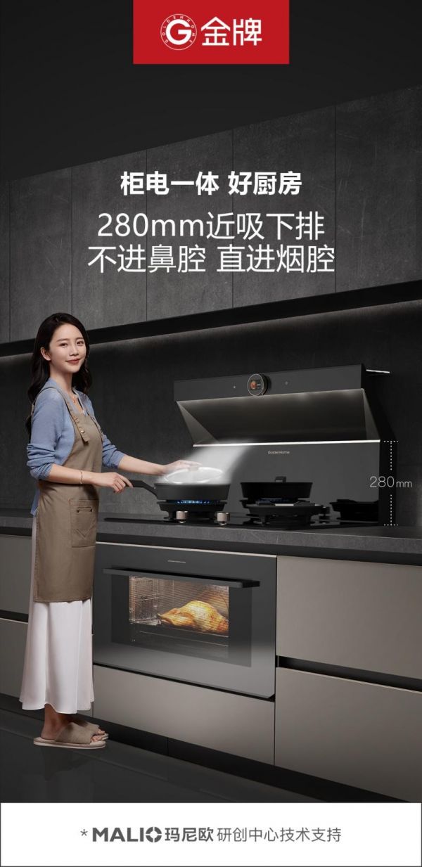 好用才是王道!金牌柜电一体好厨房,烟灶采用黄金吸油烟高度280mm,在不影响灶具热能转化的同时,油烟近吸下排,不进鼻腔,直进烟腔,轻松应对各种烹饪场景,哪怕是厨房社交场景也不在话下,实现厨房畅排无阻,无烟、低噪音,满足用户对健康美好厨房生活的想象。
