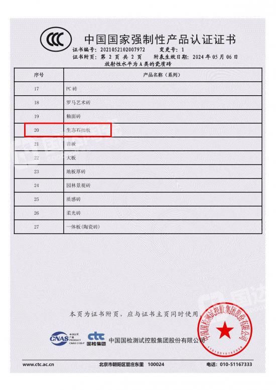 近日,国达陶瓷生态石扣板成功通过国家3c产品认证,吸水率<0.5%,符合附录G标准,获得《中国国家强制性产品认证证书》,处于外墙砖领先水平,进一步提升品牌的产品竞争力。