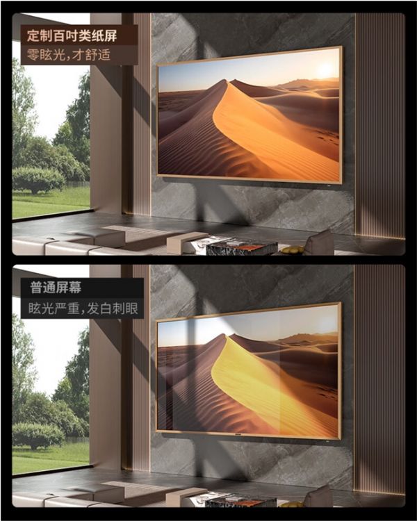 现在的超大客厅通常都采光好、灯光多、餐客厅一体视野开阔,这就要求客厅电视要有很好的抗光性能,否则会严重影响观影体验。作为战略合作伙伴,创维联合京东方(BOE)先进的显示技术,为100A7E Pro特别定制「百吋类纸屏」。其采用了纳米蚀刻技术,将屏幕表面的光线漫反射到不同角度,有效减少了电视屏幕的眩光、反光和倒影现象。即使在阳光充足、视野开阔的大厅中,显示效果也能保持清晰,不受强光干扰。此外,类纸屏的显示效果如纸张般舒适,不仅减少了眼睛的疲劳感,还为您带来了更加健康、自然的观影体验。
