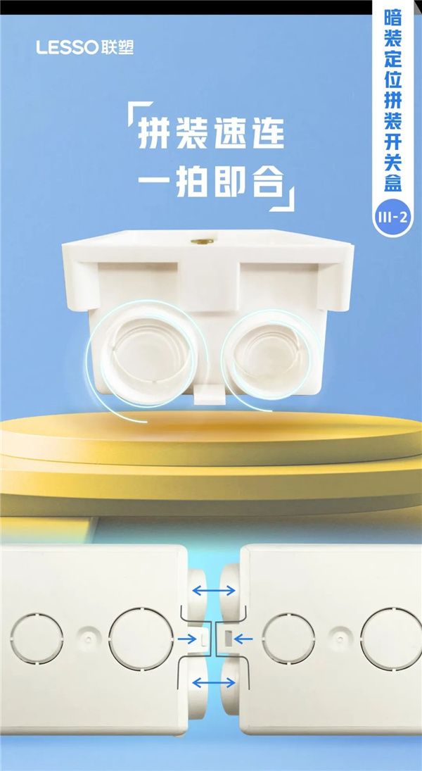 联塑暗装定位拼装开关盒,凭借其无缝秒装的便捷性、无限延伸的灵活性、一拍即合的速连性、灵动兼容的设计理念,以及无需螺丝的双扣位固定技术,不仅大幅提升了电路安装的效率与安全性,更赋予了现代家居电路布局前所未有的自由度与创造性。联塑,让电路布局随心拓展,为你的智慧生活插上想象的翅膀。