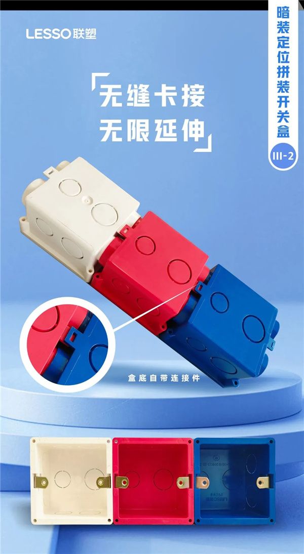 无缝卡接,无限延伸 —— 创新的盒底自带连接件设计,不仅简化了连接过程,更实现了盒子间的无缝拼接,无限延伸的可能让电路布局更加灵活自如。无论是新居装修还是旧屋改造,联塑暗装定位拼装开关盒都能轻松应对,适应各种空间需求,拓展电路布局的无限可能。