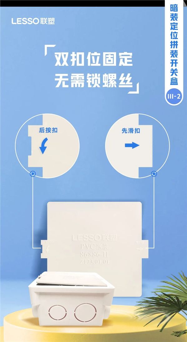 双扣位固定,无需锁螺丝 —— 独特的双扣位固定设计,让用户告别繁琐的螺丝安装过程。只需先滑扣,后按扣,即可形成稳固的连接,既保证了盒子的紧密度,又确保了安装的便捷性,体现了联塑对用户体验的深度思考。而且联塑暗装定位拼装开关盒定位精准,一装即平,设置四角定位键,安装便捷,固定牢固。