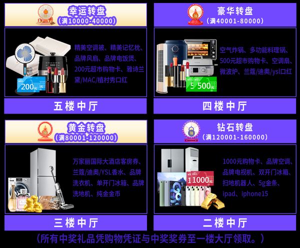 注:参与抽奖活动需加盖售后服务章的购物凭证与付款凭证,满8万以上需跨2个品牌方可参与抽奖。如高额转盘礼品抽取完毕,可顺延参与其他金额转盘抽奖,根据实付金额对应抽奖次数。