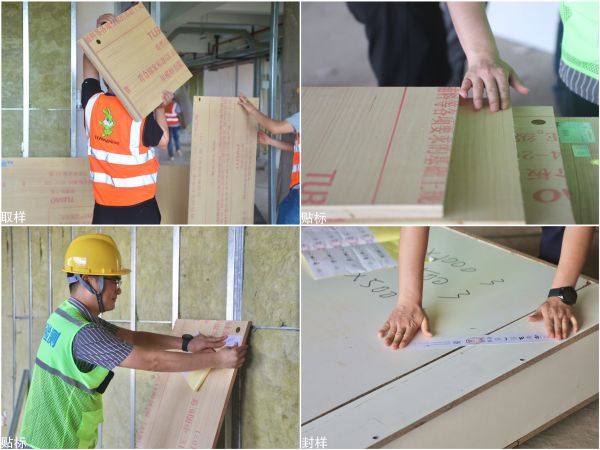在湘安消防公益服务中心、湖南建投六建三分公司和兔宝宝工程经销商的见证下,CTI华测检测对现场难燃板产品进行了抽样、贴标、封签等一系列严格操作。取样产品将被直送国家防火建筑材料质量检验检测中心、国家人造板与木竹制品质量检验检测中心进行检测,检测完成后,将公示检测结果。