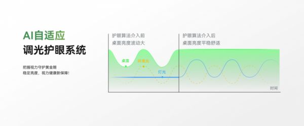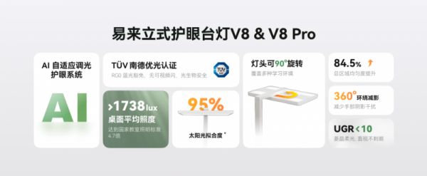 易来立式学习灯V8 & V8 Pro拥有AI自适应调光护眼系统。17点至20点是学生居家学习的时间,是近视的高发期和敏感期,也是保护视力的黄 金期。由于太阳落山,光环境从亮到暗,睫状肌需要收缩调整进光量,造成视觉疲劳。AI自适应调光护眼系统通过智能感应与自适应调光技术,实时监测桌面光线并感应周围亮度,通过Al算法精准调控灯光,稳定桌面照度,补偿环境光波动,有效缓解视觉疲劳,温柔照亮孩子的学习旅程。