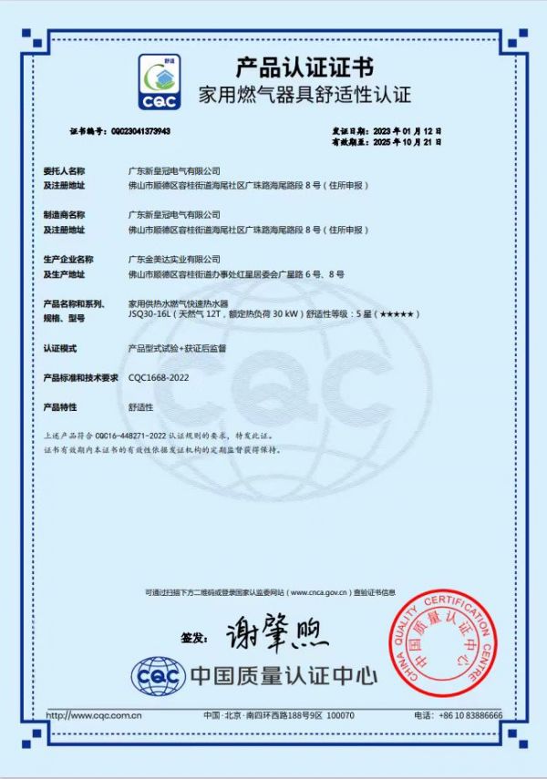 2023年1月,皇冠燃气热水器恒温系列JSQ30-16L也顺利成为中国质量认证中心发布家用燃气快速热水器CQC认证规范及实施规则后,首批通过测试并达到技术规范要求,获得最高等级认证的——舒适性五星级产品。