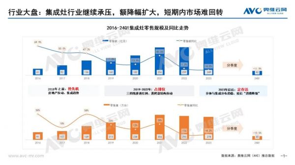 根据奥维云网的数据推总显示,2024年一季度中国厨卫大电(烟、灶、消、洗、嵌、集、电、燃、净)市场零售量1974万台、零售额314亿元,同比分别增长4.4%、3.2%。