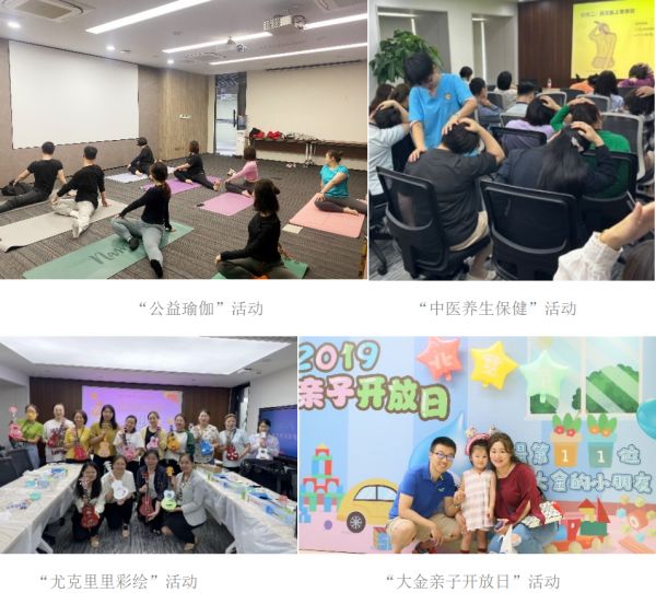 大金不仅为女员工搭建了爱心妈咪小屋,也持续为大金员工提供文化活动。如“公益瑜伽活动”、“中医养生保健”等健康关爱活动;“大金‘女神’周”节日关爱;“品茗·点茶”、“艺术插花DIY活动”、“尤克里里彩绘”等生活艺术活动;“大金快乐家庭日”、“大金亲子开放日”等亲子活动……这些活动使得大金员工在参与其中的同时,丰富了自己的生活,开阔了视野,保障了大金员工的身心健康。