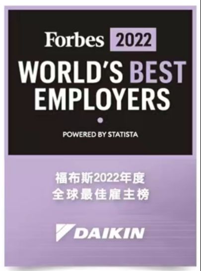 作为始终将员工幸福和发展放在首位、致力于创造一个多元化、包容性强的全球性企业,大金在2022年上榜了“福布斯全球最佳雇主”,不仅体现了大金对员工的尊重和关怀,更彰显了大金集团在员工职业发展方面的责任和承诺。