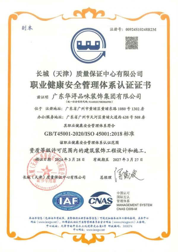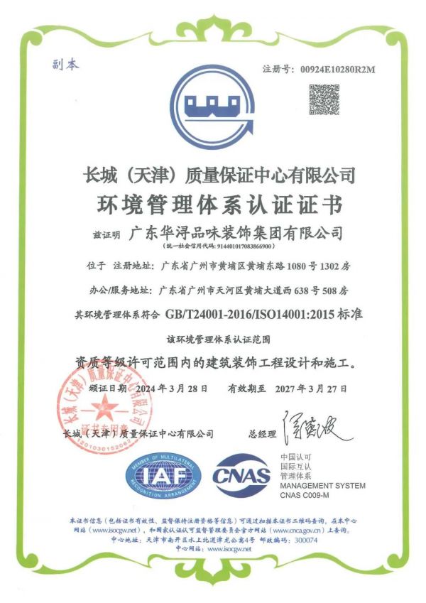 凭着26年的坚持不懈和不断努力,华浔品味装饰集团的环境管理和职业健康安全管理,都得到了社会各界的认可,还获得了国家的肯定,通过了多项国家级认证在饰界有口皆碑。3月底,华浔品味装饰集团更是再次顺利获得由国家认可的第三方认证机构长城(天津)质量保证中心颁发的环境管理体系认证证书、职业健康安全管理体系认证证书。