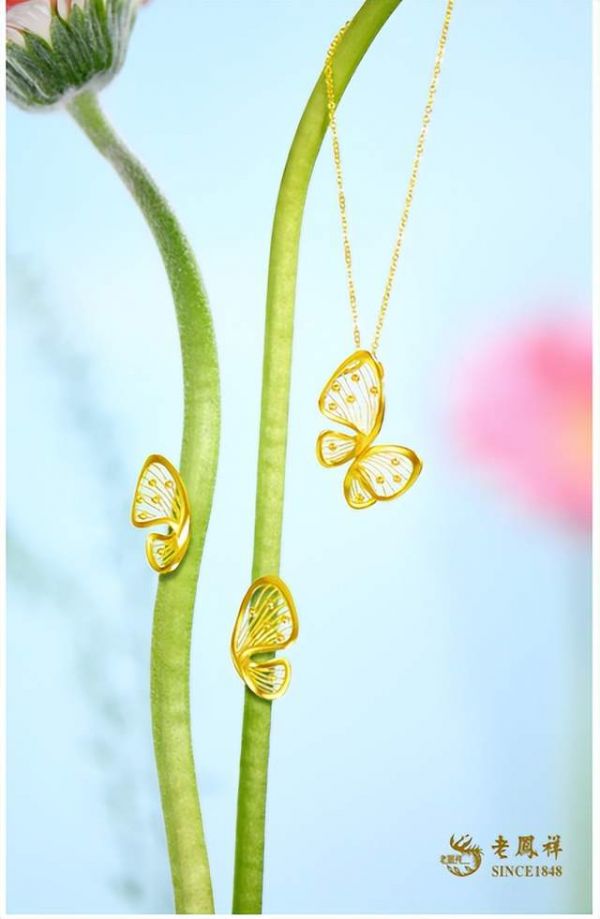 这一系列巧妙地以蝴蝶为设计元素,寓意着轻盈自由、活力四射的生活态度。其项链采用精细的花丝工艺,将足金细丝巧妙编织,勾勒出蝴蝶翅膀的细致纹路和优美线条。层次感丰富,视觉效果如同精致的蕾丝织物般,令人叹为观止。同时,镂空工艺的运用,使得整个饰品更加轻盈飘逸,无论是日常佩戴还是出席重要场合,都能展现出佩戴者的独特品位和优雅气质。把它作为520礼物,更寓意着“寻蜜(觅)”到人生的另一半,携手共度甜蜜生活的美好寓意。
