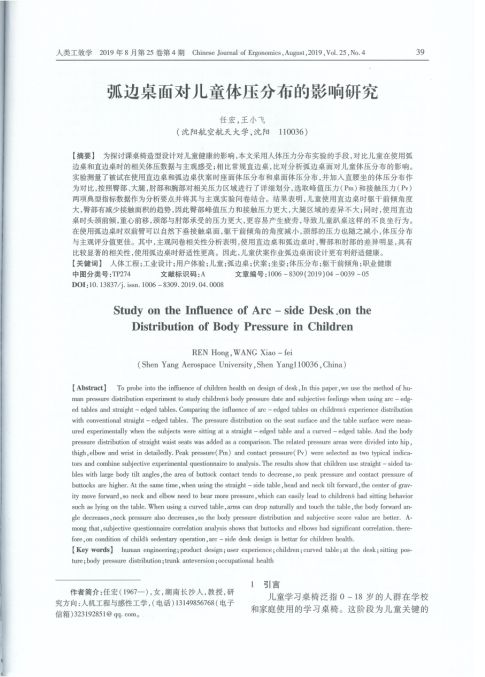 而后期的《弧边桌面对儿童体压分布的影响研究》也证实了弧边桌对孩子的正面作用,任宏和王小飞教授采用人体压力分布实验的手段,对比儿童在使用弧边桌和直边桌时的相关体压数据与主观感受,并按照臀部、大腿,肘部和腕部对相关压力区域进行了详细划分,结果表明使用直边桌时头颈前倾,重心前移,颈部与肘部承受的压力更大,更容易产生疲劳,导致儿童趴桌这样的不良坐行为。在使用弧边桌时双前臂可以自然下垂接触桌面,躯干前倾角的角度减小,颈部的压力也随之减小,体压分布与主观评分值更佳。使用弧边桌进行伏案作业,臀部和肘部承受的压力更小,其主要原因是在使用弧边桌时,躯干进入小C口,双前臂垂直落下时即可以接触桌面,身体前倾的角度更小,因此身体重心前移的量和脊柱承受的压力更小,疲劳度降低,减少了儿童趴桌行为的概率,降低脊柱变形、驼背、耸肩等不良影响发生的可能性。