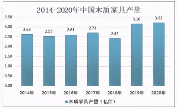 根据国家统计局数据显示,2020年中国木质家具产量为3.22亿件,较2019年的3.16亿件同比增长1.9%。此后也在逐步递增,2021年和2022年中国木质家具的产量分别达到了3.8亿件、4.12亿件,我国木质家具产量整体呈上升走势。