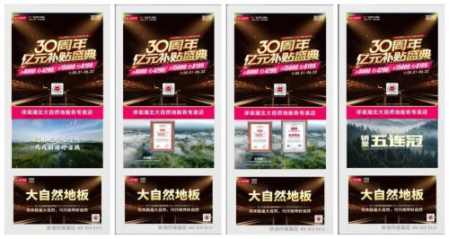 自1995年创立以来,大自然家居一直致力于推动行业的高质量发展,也提倡回归消费者,与消费者零距离。从连续五年全国实木地板销量第一的稳居地板行业龙头地位到大家居集团,在探寻企业增长路径的同时也打出中国质量万里行、万人i疯抢等现象级营销之战。如今,三十而砺,大自然家居30周年亿元补贴盛典,一连三拳,从营销玩法设计创新,开拓新增长点,走出低价竞争的怪圈,实现声量与销量齐飞。在不确定的增长时代,带来了确定性增长,也带动了品牌营销节点的认知度和差异度的提升,在周年庆IP营销这个命题上,探索出有竞争力的路径。