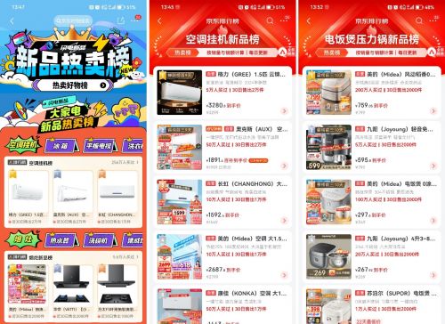 “新品热卖榜”则是从品类维度将新品做了更细致的划分,包括大家电、小家电、家具建材、日用厨具四大品类新品热卖榜,其中又细分到冰箱、空调、烟灶热水器、洗地机、饭煲压力锅、浴霸灯饰、水杯灯具等共计超50个品类榜单,每个榜单涵盖30款热卖单品,并按照销量每日更新,让消费者更快、更直接地找到自己所需新品,购物不踩坑。