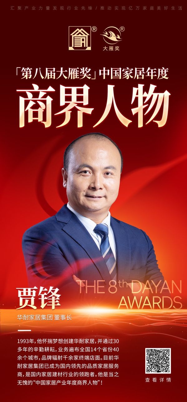 重磅揭晓!华耐家居董事长贾锋荣获「第八届大雁奖——中国家居年度商界人物」奖项称号