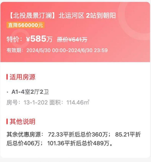 项目位于通州副中心北运河区域,距地铁6号线物资学院路站约2.5公里,2站即是朝阳区;约114平米特价房源,直降56万,折后总价约585万。