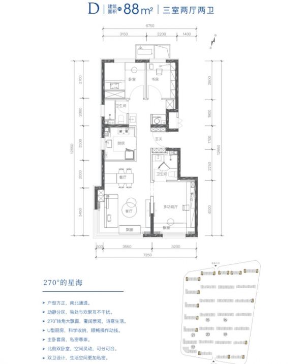 解析:南向整体面宽7.25米,亮点在客厅,为270转角客厅设计,采光、视野满分,这种设计很受年轻人喜爱。主卧套房设计,保证私密性;厨房、餐厅紧挨着,动线合理,且厨房U型设计,相比较L型的,个人更喜欢U型设计,两个同时做饭也可以满足,且能收纳更多的厨房用品。这户型也是三居双卫设计,亮点在客厅设计,保证室内采光充足。
