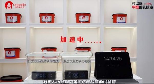 我们反复研究他们的除醛试验,他们在PVC板上滚涂了德国美阁乐的除甲醛乳胶漆,晾干以后放在密封的试验箱里面做甲醛喷雾测试。一个试验箱里面放涂了美阁乐除甲醛乳胶漆的PVC板,另外一个为空箱子,先后喷入同样剂量的甲醛喷雾,两边数据快速上涨,并且涨到3.0就爆表了。13分钟的时候,有美阁乐除甲醛乳胶漆的密闭箱子,甲醛含量快速下降,另一个箱子纹丝不动。