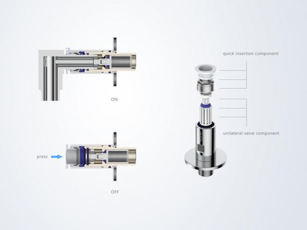 简洁美观,Plug角阀让卫浴生活更便捷。Plug角阀以其角阀主体和接头组成,创造性地融合快插与单向阀结构,以简洁圆形诠释极致几何美感。该设计不仅使安装过程简单快捷,有效规避了传统角阀在旋紧软管时的繁琐与不便,更在角阀尾部加入金属滤网,有效过滤杂质,保证了产品的卓越性能与长久寿命。此外,其极简形态也体现了绿色环保的理念,通过最少的用料实现最大的功能。
