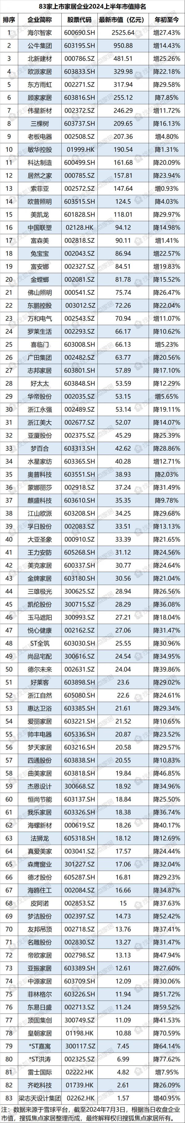 83家上市家居企业2024上半年市值表现:超8成下滑 15家破百亿