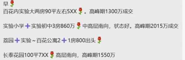 但近期,百花片区重新被中介力推,比如“实验大两房90平方米左右5XX万元,高峰期1300万元成交”“38平方米,390万元”等。