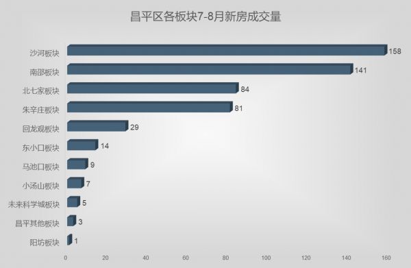 从下图可以看出,7-8月期间,昌平新房市场的主力成交板块为沙河板块、南邵板块、北七家板块、朱辛庄板块、回龙观板块。