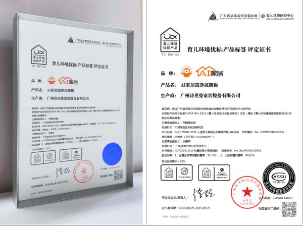 近日,AI家居高净抗菌板顺利通过广东省采购与供应链协会标准化专委会•育儿环境研究中心的甲醛释放量、抗菌性能核验评定,产品符合标准TGPSA 001-2022《育儿环境设计与建设导则》主旨,满足《育儿环境健康要素蓝皮书2023》的建议限量要求,获颁育儿环境优标产品符合性评价证书,再次验证AI家居高净抗菌板达到了优于新国标ENF级更严格的环保与健康要求,具备儿童友好、适儿化所需要的高质量产品属性。