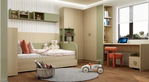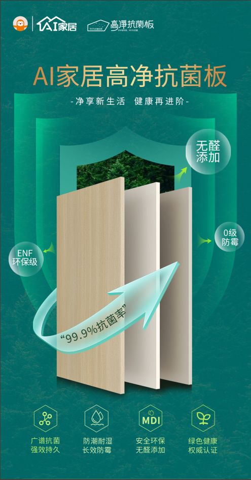 AI家居高净抗菌板,作为集“无醛添加、抗菌、防霉”三重守护力于一体的环保板材,是品牌为广大消费者打造健康整家新防线,积极推进国家儿童友好空间体系建设的拳头产品。从原材料的选取、基材成型,到裁板切割、封边贴面,生产过程不添加甲醛物质,真正实现无甲醛添加。
