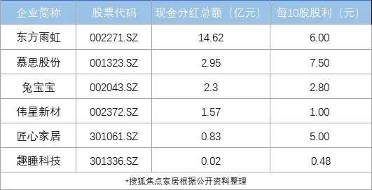 根据搜狐焦点家居不完全统计,截至2024年9月20日,东方雨虹、 慕思股份、兔宝宝、伟星新材、匠心家居、趣睡科技6家A股上市家居企业披露了现金分红计划。其中,东方雨虹、慕思股份、兔宝宝、伟星新材分红超亿元。