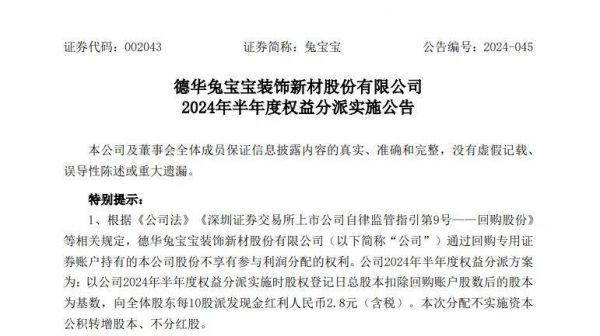 兔宝宝(002043.SZ)发布公告,公司2024年半年度权益分配实施方案内容如下:以总股本82142.56万股为基数,向全体股东每10股派发现金红利人民币2.80元,合计派发现金红利人民币2.30亿元,占同期归母净利润的比例为94.21%,不送红股,不进行资本公积转增股本。