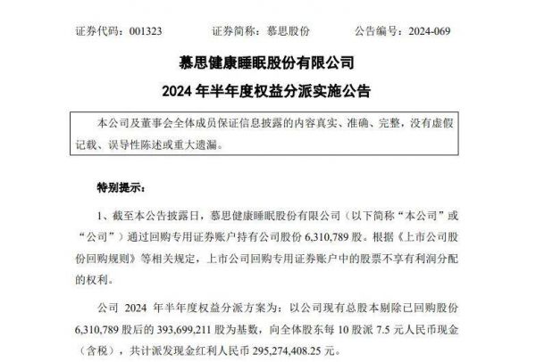 慕思股份(001323.SZ)发布公告,公司2024年半年度权益分配实施方案内容如下:以总股本39369.92万股为基数,向全体股东每10股派发现金红利人民币7.50元,合计派发现金红利人民币2.95亿元,占同期归母净利润的比例为79.12%,不送红股,不进行资本公积转增股本。本次权益分派股权登记日为9月26日,除权除息日为9月27日。