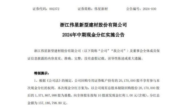 东方雨虹、慕思股份、兔宝宝、伟星新材等企业2024年半年度分红破亿