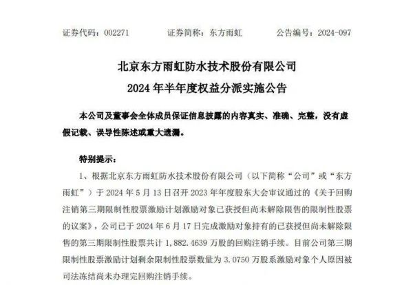 东方雨虹(002271.SZ)发布公告,公司2024年半年度权益分配实施方案内容如下:以总股本243628.48万股为基数,向全体股东每10股派发现金红利人民币6.00元,合计派发现金红利人民币14.62亿元,占同期归母净利润的比例为154.97%,不送红股,不进行资本公积转增股本。
