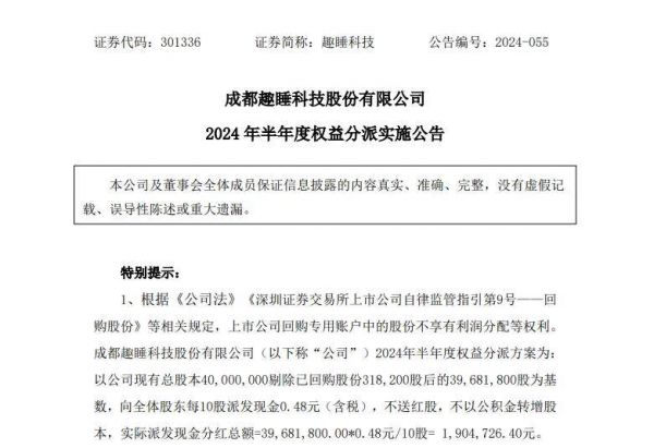 趣睡科技(301336.SZ)发布公告,公司2024年半年度权益分配实施方案内容如下:以总股本3968.18万股为基数,向全体股东每10股派发现金红利人民币0.48元,合计派发现金红利人民币190.47万元,占同期归母净利润的比例为13.55%,不送红股,不进行资本公积转增股本。