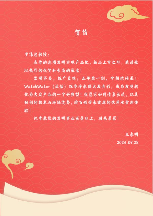 图:王码五笔字形发明人、中国发明协会荣誉副会长王永明先生写给WatchWater(沃恬)双零净水器发明人曹伟达教授的贺信