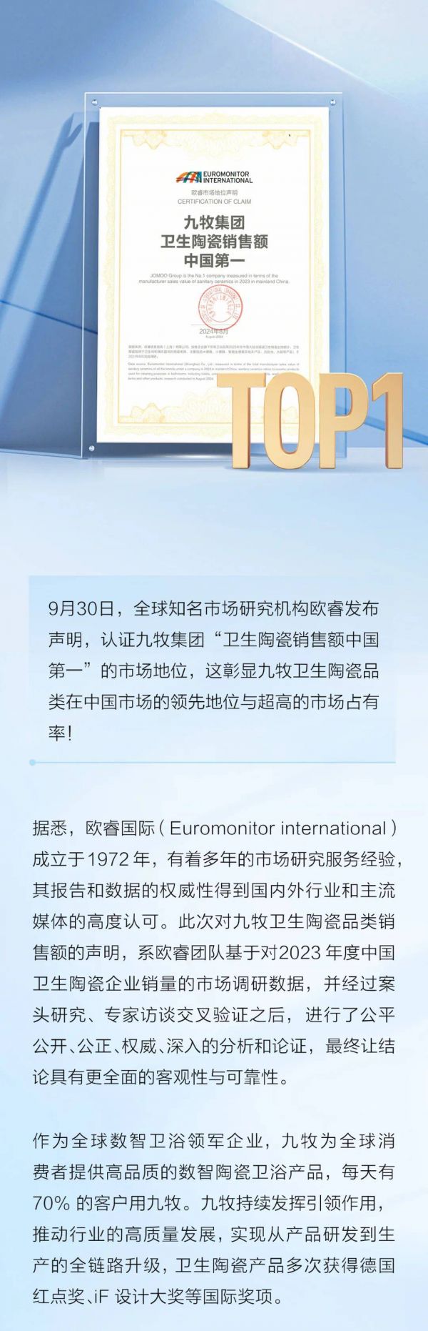中国第一!九牧卫生陶瓷销售额遥遥领先!