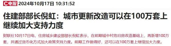在前期城中村危旧房改造基础上,再新增100万套,并通过货币化方式加大政策支持力度。前期工作做得好,还可以在100万套上继续加大力度。