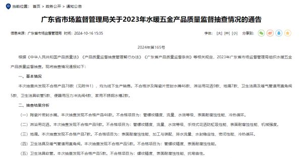 近日,广东省市场监督管理局发布关于2023年水暖五金产品质量监督抽查情况的通告,本次抽查共发现不合格产品78款,均为线下生产销售。不合格涉及陶瓷片密封水嘴46款、淋浴用花洒9款、地漏7款、卫生洁具及暖气管道用直角阀5款、卫生洁具软管5款、便器用压力冲洗阀4款、家用不锈钢水槽2款。