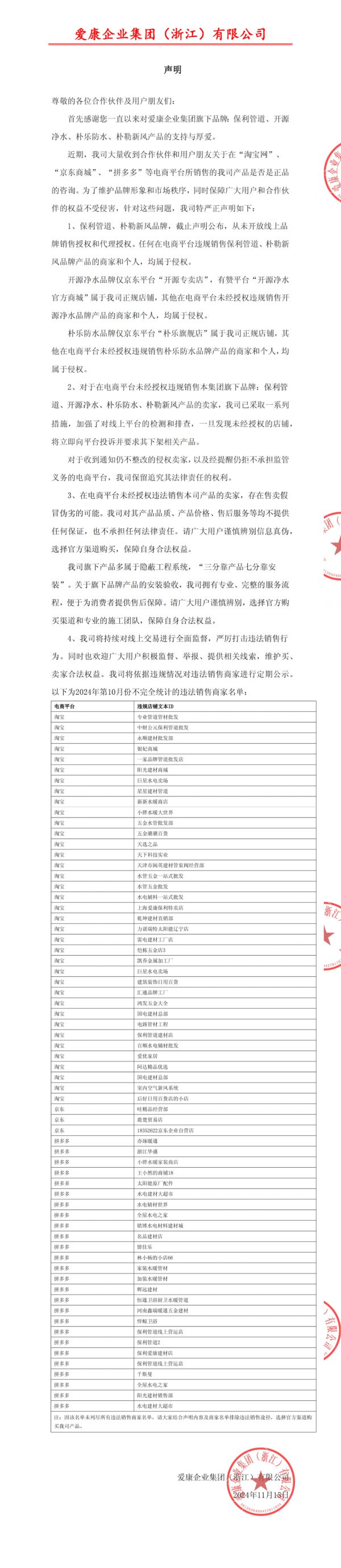 爱康企业集团公示10月份电商平台违法销售其旗下品牌产品的店铺名单