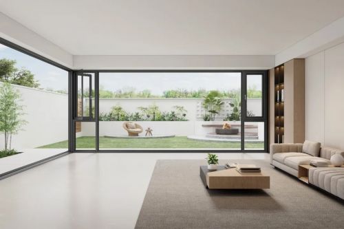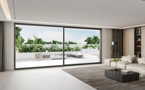 大平层住宅拥有大尺度的空间面积,在设计布局上更加注重整体空间的开放性和流动性,通常可以用门窗作为家居功能区之间的连接和隔断,通过灵活开合的特点打破空间局限,延伸空间视觉,营造出更加开阔大气、舒适宽敞的的居家体验。奢驰T系列推拉门,采用极简窄边设计,舍去繁复,极简轻盈,描绘出极具艺术线条的空间美学。超大面宽的落地玻璃,让客厅与庭院之间“界而不限”,让空间视觉扩大N倍,彰显出从容大气的格局,完美适配大平层住宅凝练、细腻的家居质感。