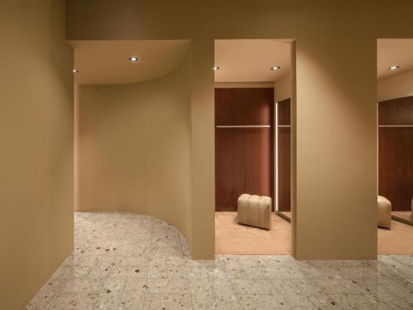 门店休息空间设置了共同呈现现代美学的沙发(来自Audo)与休闲椅(来自HAY),其柔和圆润的造型与定制纸塑艺术感咖啡桌精致的纹理相得益彰(来自Paper Factor)。试衣空间则配设有手工软垫座椅(来自NOR11),与充满现代感的深色木质饰面形成柔和的对比。