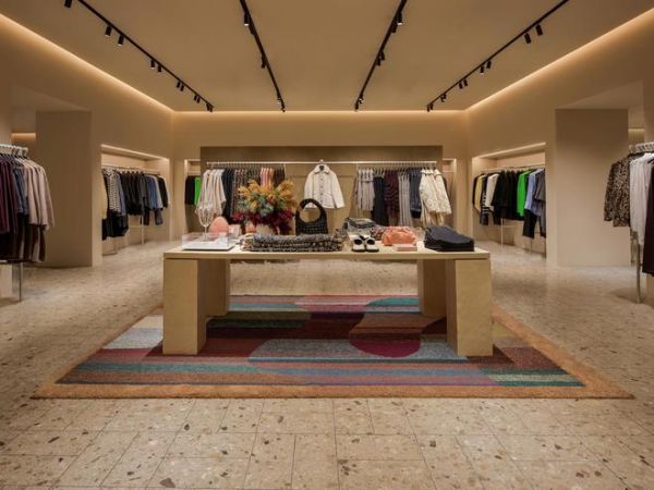 室内设计融合了本地元素与创新灵感。墙体采用石膏材料 (来自Amourcoat),将随着时间与水中的矿物质产生奇妙反应,呈现出和谐自然和色调独特的墙面效果。COS 最新系列陈列于可循环使用的轨道系统和升级利用的货架(货架来自Smile Plastics),地面亦由可持续成分高达90%的水磨石地板砖铺就(来自Grassi Pietre),并饰以循环纱线材料手工簇绒地毯(来自Kasthall),质感细腻舒适。