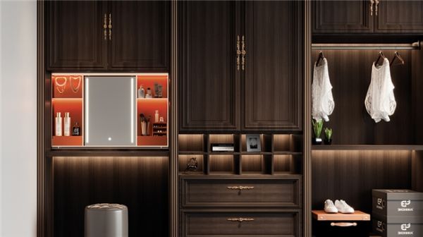 紫珑Pro系列的另一大亮点便是配套的智能五金产品——智能电动升降美妆柜,采用先进的人机互动语音控制系统,用户只需语音指令即可实现美妆柜的升降、开启与关闭等操作,让化妆过程充满仪式感。