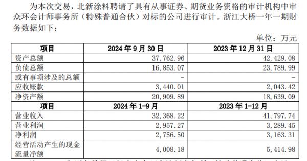 公开资料显示,浙江大桥油漆有限公司,成立于2000年,杭州市实业投资集团成员,位于浙江省湖州市,是一家以从事化学原料和化学制品制造业为主的企业。截至2024年9月30日,浙江大桥的资产总额为3.78亿元,负债总额为1.69亿元,净资产为2.09亿元。2024年1-9月营业收入为3.24亿元,净利润为2757万元。